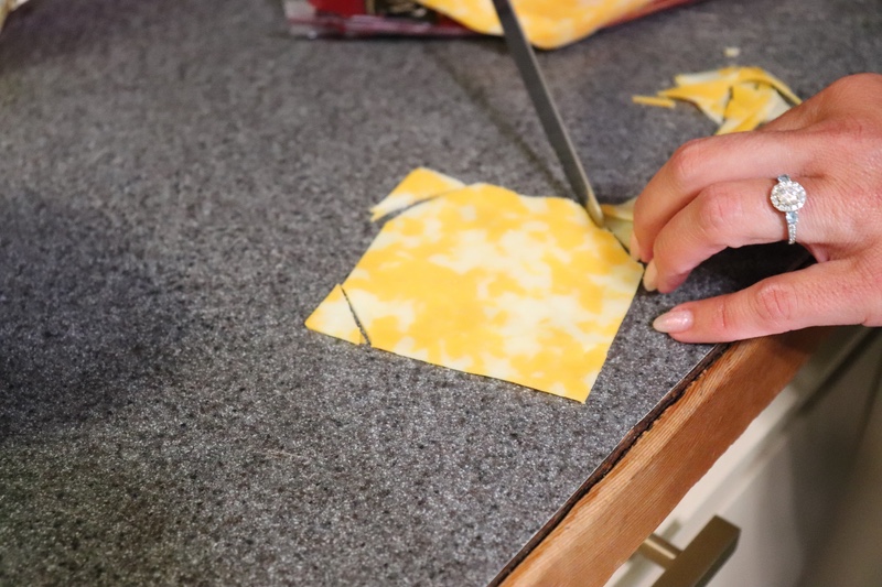 - Take two slices of cheese and cut corners off (Optional) this helps it fit into a mini waffle maker. Skip if using a full sized waffle maker.
