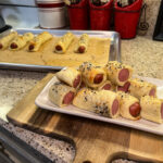 Using a silicone matt, or parchment, knead dough briefly. Wet hands often to help dough behave. Divide dough into 8 even pieces. Spread around hot dogs.