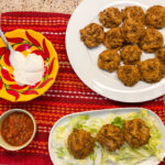 Using a cookie scoop or a spoon, form mixture into 1 1/2 inch balls. Place on prepared baking tray. Bake 20 minutes. Allow to cool. Serve with salsa, or favorite Mexican sauces if desired.