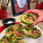 Carefully scoop avocado halves. scooping out a bit of the middle to make room for filling. Alternately, slice avocados on a plate.